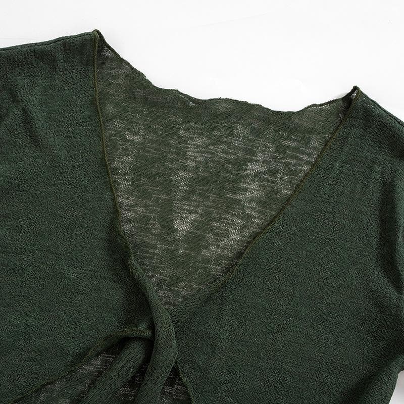 Be the first to review “Sheer mesh see through v neck knotted irregular long sleeve skirt set”
